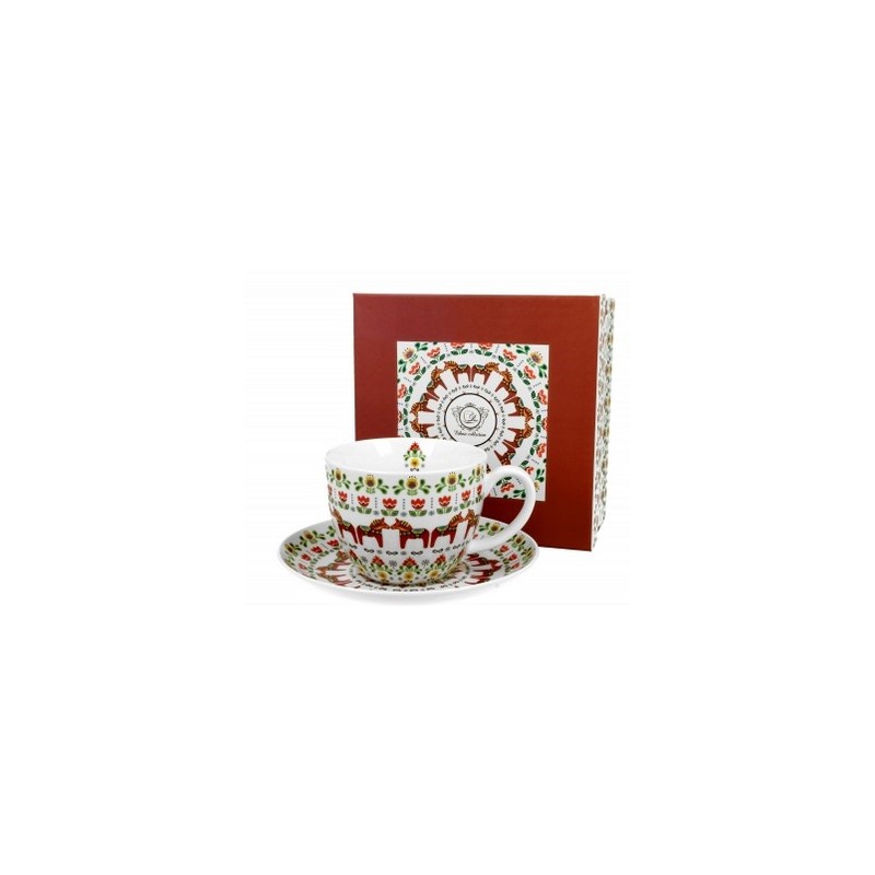 Filiżanka jumbo ze spodkiem wykonana jest z porcelany New Bone China. Całość zapakowana w ozdobne pudełko dekorowane tym samym motywem.