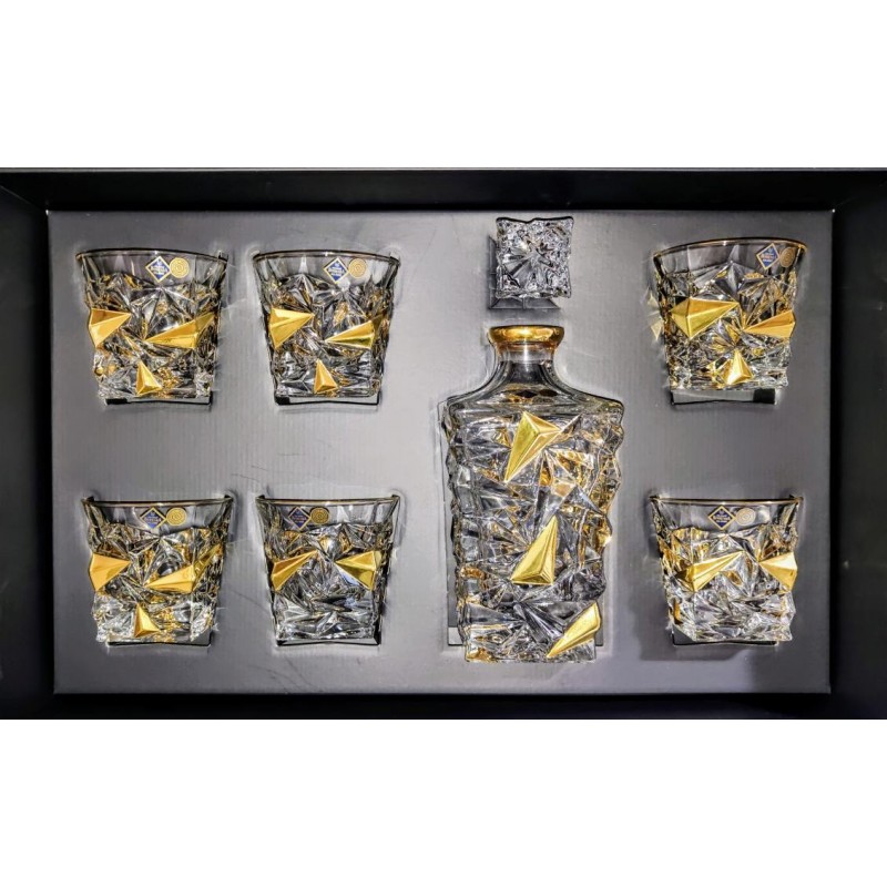 Elegancki zestaw - sześć szklanek i karafka (6+1) do whisky o wyjątkowym i nowoczesnym wyglądzie z serii GLACIER OSZRONIONY GRUBYM POŁYSKLIWYM ZŁOTEM.
