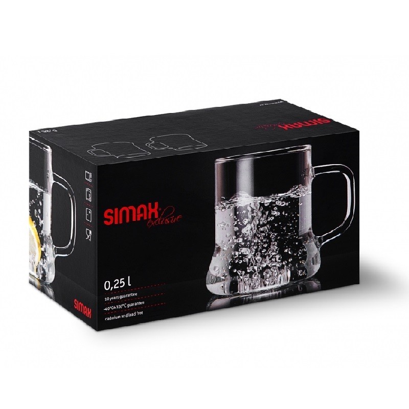Kubki z wysokiej jakości szkła SIMAX, odpornego na wysokie i niskie temperatury, nadają się do podawania różnych płynów (herbaty, kawy, mleka, wody sokowej, piwa). Można zmywać w zmywarce.