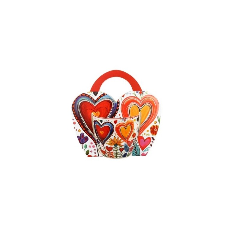 Zobacz większe Kubek 460 ml w "koszyczku" KOLOROWE SERCA 2 charakteryzuje się naturalnym kremowo-białym kolorem z delikatnym połyskiem oraz wyjątkową wytrzymałością i trwałością, zachowując lekkość i finezję.